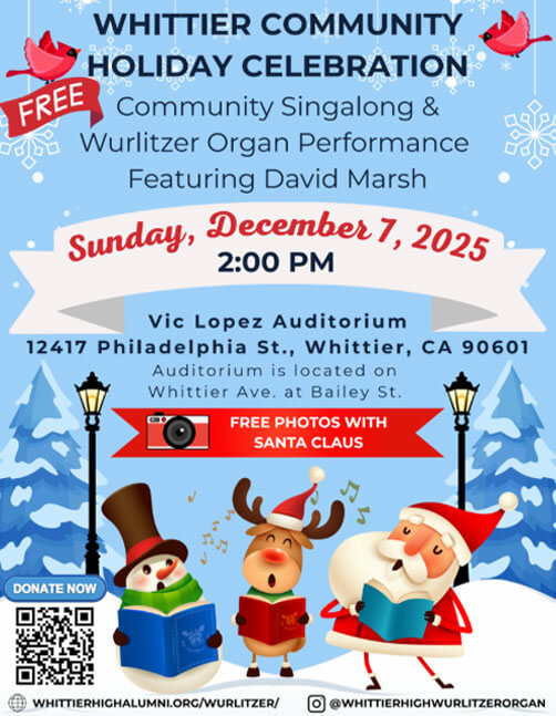 The 4th of July concert will be Sunday, December 7, 2025, at 2:00 PM at Whittier High School’s Vic Lopez Auditorium, featuring David Marsh on the Wurlitzer Organ and Jonathan Tupanjanin as Santa. We look forward to seeing you at this event!